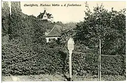 - Gauschule „Haideberg“ (Postkarte 1938). Rückseite mit Lage oben auf der Hangkante.