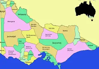 - Der Clan der Brayakuloong hat sein Stammesgebiet um Sale, Providence Ponds, Avon- und Latrobe-River; westlich von Lake Wellington bis Mounts Baw Baw und Howitt.