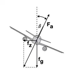 Um ein Flugzeug eine Kurve mit dem Radius fliegen zu lassen, muss das Flugzeug in Richtung Kurvenzentrum mit der Beschleunigung zentripetal beschleunigt werden. Um diese Beschleunigung zu erreichen, muss auf das Flugzeug der Masse eine zentripetale Kraft wirken. Diese Kraft wird mit dem Auftrieb der Flügel geschaffen, indem das Flugzeug in Richtung Kurvenzentrum gekippt wird. Der Auftrieb der Flügel wird beim Neigen des Flugzeuges vektoriell in eine senkrechte und in eine zentripetale (horizontale) Komponente geteilt. Die senkrechte, nach oben wirkende Komponente ist dem Gewicht des Flugzeuges entgegengerichtet und hat denselben Betrag wie das Gewicht: . Mit dem Flugzeug-Neigungswinkel (englisch bank-angle genannt) wird die zentripetale Kraft betragsmäßig
