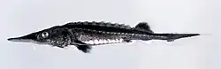 Die Tiere weisen den typischen Körperbau der Störe mit langgestrecktem Körper, unterständigem Rüsselmaul, heterozerker Schwanzflosse und fünf Reihen von Knochenplatten entlang des Rumpfes auf. Gewöhnlich erreichen die Tiere eine Länge bis 1,43 m und ein Gewicht von 23 Kilogramm. Der Körper ist dunkelbraun mit gelblichem bis weißlichem Bauch und dunklen Knochenplatten. Die Schnauze ist stets lang und V-förmig zugespitzt. Zwei Paar kurzer, schlanker Barteln sitzen etwas vor der halben Strecke von der Schnauzenspitze zum Maul. Über dem Auge liegt ein Knochenkamm. Die Iris ist bronze-, gold- oder kupferfarben. Die Rückenreihe weist 7 bis 13 Knochenplatten auf, die seitlichen Reihen haben 22 bis 34. Zwischen After und Afterflosse sitzen 6 bis 11 kleine Platten in Paaren. Zwischen den großen Knochenplatten liegen zahlreiche winzige, rautenförmige Plättchen. Die Rückenflosse weist 33 bis 42 Weichstrahlen auf.[4][5]