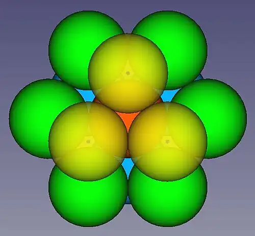 Die mittige rote Kugel wird von 6 grünen Kugeln in gleicher Ebene, 3 gelben Kugeln darüber und 3 um 60° gegen die gelben verdrehten blauen Kugeln darunter berührt.