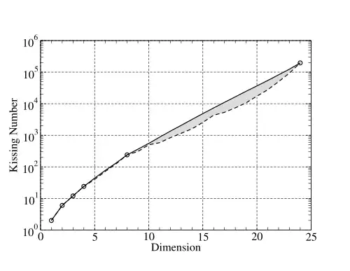 Die folgende Tabelle gibt die bekannten Grenzen für die Kusszahl bis zur Dimension 24 wieder.[9]