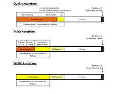 Dies sind wohlgemerkt nur Mindestanforderungen – in der Praxis sind die Kakaogehalte oft viel höher, von 50 bis 100 %. Kuvertüre mit einem hohen Gehalt an fettfreier Kakaotrockenmasse wird auch als „dunkel“, „zartbitter“ o. ä. bezeichnet; nach österreichischem Lebensmittelbuch ist bei solchen Bezeichnungen ein Mindestgehalt von 16 % fettfreier Trockenmasse vorgeschrieben.[8]