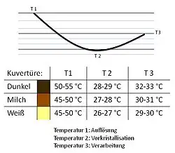 Kakaobutter ist ein Gemisch verschiedener Pflanzenfette, das polymorph kristallisiert, d. h., es gibt verschiedene mögliche Gitterstrukturen (fachsprachlich Modifikationen) – nur eine dieser Modifikationen, meistens mit dem Buchstaben β oder der römischen Zahl V bezeichnet, ist stabil und hat den für den Schokoladengeschmack wichtigen Schmelzbereich bei ca. 34 °C. Der Erstarrungsvorgang der Kuvertüre muss daher mechanisch und thermisch so beeinflusst werden, dass möglichst viele Kristallisationskeime in der β-Modifikation entstehen. Eine solche Vorkristallisation erreicht man prinzipiell dadurch, dass die vorhandene Kristallstruktur zunächst bei hoher Temperatur (um 45 °C) vollständig geschmolzen wird; anschließend wird die Schokolade unter ihren normalen Schmelzpunkt gekühlt, um die Kristallisation in Gang zu setzen; bevor sie jedoch vollständig auskristallisiert, wird die Temperatur wieder auf knapp über 30 °C erhöht, wo die instabilen Modifikationen bereits geschmolzen sind. Währenddessen wird die flüssige Schokoladenmasse auf verschiedene Weise mechanisch behandelt, um die Kristallisation der stabilen Modifikation zu begünstigen; (zu den Verfahren siehe weiter unten). Bei dieser Temperatur wird die Schokolade dann verarbeitet und danach langsam wieder abgekühlt. Der Gesamtvorgang wird Temperieren genannt; die optimalen Temperaturen hängen von der genauen Zusammensetzung der Kakaobutter ab, die zwischen verschiedenen Sorten, Ernten, Herstellungsverfahren usw. schwankt.