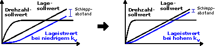 - Bei konstanter Geschwindigkeit führt ein höherer kv-Faktor zu geringerer Lageabweichung bzw. geringerem Schleppabstand, d. h. zu höherer Positioniergenauigkeit (vgl. Abb.).