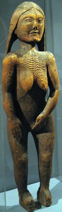 Der ehrenvollste Platz war am Ende des Hauses gegenüber der Eingangstür. Da grundsätzlich das Recht zur Holzgewinnung bei bestimmten Familien lag, die im Allgemeinen auch die Häuptlinge stellten, deren Stellung wiederum erblich war, musste dieser bei einem Hausbau um die Stellung von Holz gebeten werden. Aus diesem Material wurden auch Kanus gebaut, die beinahe die einzige Möglichkeit waren, in dem unwegsamen Gelände größere Strecken zurückzulegen. Dabei wurden die Bäume allerdings oftmals nicht gefällt, sondern nur so viel Holz herausgeschnitten wie nötig (vgl. Culturally Modified Trees).[6] Neben den Kanus wurde auch eine Art Katamaran gebaut, mit einer einfachen Segeltechnik aus Matten oder Brettern. Dazu wurden zwei Kanus miteinander verbunden. Die Kanuwände wurden oftmals reich beschnitzt.