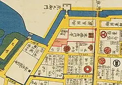 - ↑ Ausschnitt aus der Stadtteilkarte „Shibaguchi-minami“ von ca. 1850.