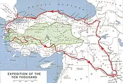 Nach dem Abschluss seiner Rekrutierungen zog Kyros den größten Teil seiner Truppen in Sardes zusammen. Von dort brach er mit seinem gewaltigen Heer etwa im März 401 v. Chr. nach Osten auf. Zunächst zog er nach Kolossai in Phrygien. Manche griechische Söldnerkontingente stießen erst unterwegs zu ihm, so der Thessaler Menon mit 1500 Mann in Kolossai.[23] Klearchos kam mit 2000 Mann in die Stadt Kelainai, die nächsten Station auf Kyros’ Marsch. Ebendort führte auch Sophainetos dem persischen Prinzen ein Söldnerheer zu. Kyros musste in Kelainai ein Monat rasten, bis sich alle griechischen Verbündeten eingefunden hatten. Insgesamt umfassten seine griechischen Streitkräfte, die den Kern seiner Armee darstellten, rund 10.000 Schwerbewaffnete und 2000 Peltasten, die unter dem Oberbefehl des Klearchos standen. Den Hauptteil seines Heeres machten die von ihm ausgehobenen persischen Truppenverbände – einige zehntausend Infanteristen und mehrere tausend Reiter – aus, die vom Feldherrn Ariaios kommandiert wurden. Zudem wurde Kyros von einer Leibwache von 600 Kavalleristen begleitet. Auch Ärzte, Händler, Seher, Mätressen und Diener nahmen an Kyros’ Zug teil.[24]