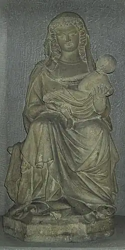 Bei der ca. 107 cm hohen Skulptur aus grauem Sandstein handelt es sich um eine Sitzmadonna. Die gesamte Komposition ruht auf einer unregelmäßigen sechseckigen Plinthe; die Gottesmutter thront auf einer Bank mit profilierter Sitzplatte und ist in ein langärmliges Untergewand sowie einen Mantel gekleidet. Ein reich verziertes Diademband und ein Kopftuch schmücken das lockige Haar. Dem Kopftuch vergleichbar ist das Tuch, in welches das Jesuskind gewickelt ist. Den Knaben, der sich ihr in einer verspielten Drehung zuwendet und sich mit der rechten Hand am Gewand der Mutter festhält, stützt sie mit ihrem linken Arm. Ihre rechte Hand kommt dem Betrachter in einer einladenden Geste entgegen, als wollte sie eine Gabe annehmen. Die Gestaltung des Gesichtes der Madonna entspricht keiner Idealisierung: Die rundliche Form, die leicht gewölbte Stirn, das fliehende Kinn orientieren sich wohl an einem realen Modell.