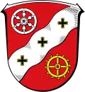 Blasonierung: „In Rot ein schräglinker silberner Wellenbalken mit drei schwarzen Deutschordenskreuzen mit goldenem Rand, darüber ein silbernes Mainzer Rad, darunter ein goldenes Mühlrad.“[5]