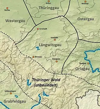 Ausgangspunkt der flächendeckenden deutschen Besiedlung und Urbarmachung des Längwitzgaus waren die Klostergründungen in Paulinzella (1108) und Ichtershausen (1147). In diese Zeit fällt auch die Gründung der meisten -hausen-Orte, gefolgt von den -dorf-, -bach- und -roda-Orten, die vom 11. bis ins 14. Jahrhundert besiedelt wurden. Als letztes folgte die Besiedlung der in den Thüringer Wald und ins Schiefergebirge führenden Täler, die keinen Ackerbau zuließen und andere Erwerbszweige notwendig machten (z. B. Fuhrgewerbe, Holz- und Weidewirtschaft).