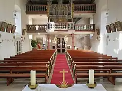 Die Kirche besteht aus einem Langhaus mit Spiegelgewölbe und vier Fensterachsen. Der Altarraum verfügt über ein Fenster nach Süden und hat ein Kreuzgratgewölbe. Der Taufstein datiert aus dem Jahre 1565, die Stuckaturen an der Langhausdecke stammen von 1732. Vom Würzburger Orgelbaumeister Johann Philipp Seuffert stammt die 1736 gebaute Orgel.[5] Die Altarblätter stammen alle von Franz Krombach.[2]