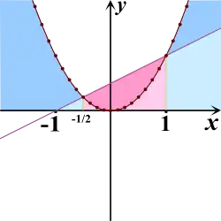 Andernfalls sind die Funktionen, die der rechten und der linken Seite der Ungleichung entsprechen, zusammen in ein Achsenkreuz zu zeichnen. Die x-Werte der Schnittpunkte geben die Grenzen der Lösungsbereiche an. Quadratische Ungleichungen der rechten Seite hervorgehenden Geraden zum Schnitt bringen. Dies ist rechts exemplarisch für die Ungleichung x²<0,5x+0,5 (roter Bereich) bzw. x²>0,5x+0,5 (blauer Bereich)gezeigt.