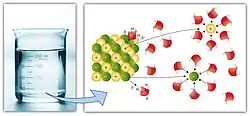 Löslichkeit bezeichnet die Eigenschaft des Stoffes, sich unter homogener Verteilung (als Atome, Moleküle oder Ionen) im Lösungsmittel zu vermischen, d. h. zu lösen. Zumeist ist das Lösungsmittel eine Flüssigkeit. Es gibt aber auch feste Lösungen, wie etwa bei Legierungen, Gläsern, keramischen Werkstoffen und dotierten Halbleitern. Bei der Lösung von Gasen in Flüssigkeiten bezeichnet der Begriff Löslichkeit einen Koeffizienten, der die in der Flüssigkeit gelöste Gasmenge bei einem bestimmten Druck des Gases angibt, wenn sich das Gas zwischen Gasraum und Flüssigkeit im Diffusionsgleichgewicht befindet, d. h. genau so viel hinein wie heraus diffundiert. Die Löslichkeit ist außerdem von der Temperatur, vom Druck (in geringem Umfang auch bei nicht gasförmigen Verbindungen) und bei einigen Verbindungen vom pH-Wert sowie der Salinität[1] abhängig.[2][3][4] Beispielhaft für die Abhängigkeit von der Salinität sei Ethanol genannt: Es ist beliebig in Süßwasser löslich[5], in Salzwasser jedoch fast unlöslich. Dieser Effekt wird beim Aussalzen genutzt.[6] Unter anderem bei Proteinen kann das Salzen auch eine Erhöhung der Löslichkeit bewirken, dann wird vom Einsalzeffekt gesprochen. In der Kolloidchemie wird die Löslichkeit genauer untersucht und auch nach Partikelgröße, Stabilität etc. differenziert. Siehe auch: Gemisch und Entmischung.