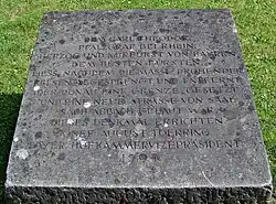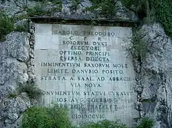 In jenem Zusammenhang ließ der (wohl auch für die Finanzierung verantwortliche) Hofkammer-Vizepräsident Reichsgraf Joseph August von Toerring seinem Landesherrn ein Denkmal errichten. Neun Meter über der Straße wurde durch den Hofsteinmetz Michael Mattheo, an der abgesprengten Felswand, eine zehn Meter hohe Steintafel mit lateinischer Widmungsinschrift an den Kurfürsten angebracht.