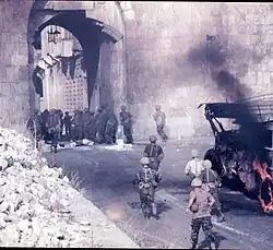 Das Löwentor ist der wichtigste Zugang von der Altstadt zum Ölberg. Im Sechstagekrieg bombardierte die israelische Armee im Morgengrauen des 7. Juni 1967 den Auguste-Viktoria-Kamm mit Napalm, worauf die jordanische Armee sich zurückzog. Israelische Fallschirmjäger nahmen den Ölberg ein. Um 9.45 beschossen israelische Panzer das Löwentor. Sie zerstörten den Bus, mit dem es blockiert war, und sprengten das Tor auf. Anschließend stürmten israelische Soldaten unter jordanischem Streichfeuer das Tor. Kurz darauf war auch der Tempelberg in israelischer Hand.[5]
