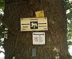 Heute bildet der Löwenweg auch einen Teil der 1982 bis 1984 ausgeschilderten Hessenwege[1], genauer den Nordteil des Hessenwegs 2, der aber auch im Ganzen als Löwenweg bezeichnet wird. Der Hessenweg 2 führt die Route des ursprünglichen Löwenweges ab Alsfeld über den Vogelsberg und Gelnhausen bis Hirschhorn am Neckar weiter und umfasst eine Strecke von 373 Kilometern[2] oder 404 Kilometer laut Ausschilderung.