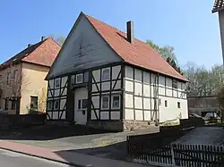 Im zweigeschossigen Rähmbau mit regelmäßigem Fachwerk mit Streben an Bund- und Eckpfosten wurde das segmentbogige Dielentor entfernt, nur noch der Holzrahmen mit Inschriftbalken ist vorhanden. An der Stelle des Tores wurde eine Wand mit Fenster eingesetzt.