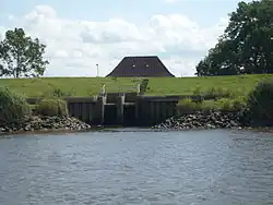 Das Schöpfwerk Heiligenstedten links der Stör, über das auch die Lübsche Wettern entwässert, von der Stör aus gesehen