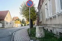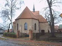 - An der Kirche steht ein Denkmal für die Gefallenen des Ersten und Zweiten Weltkrieges, eine abgestufte Stele gekrönt von einem eisernen Kreuz mit Schwertmotiv.[56]