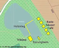 Das Ufer säumte ein weißer Sandstrand. Auf dem Gelände wurden drei Gebäude errichtet, darunter ein Café mit Freiterrasse. Später wurde ein Sprungbecken von sechs Metern Tiefe ausgehoben. Bis zum Sommer 1925 entstanden ein 10-Meter-Sprungturm, eine großzügige Zuschauertribüne am Südwestufer sowie auf der gegenüberliegenden Seite ein Verwaltungsgebäude und ein Kinderbadehaus. Das Ufer unterhalb der Tribüne wurde mit einer Betonmauer befestigt, die heute noch vorhanden ist. Ein Holzsteg umgab das Schwimmbecken.