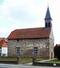 Beim Wiederaufbau, der laut Inschrift auf 1592 zu datieren ist, wurde der Bau nach Westen erweitert, was heute durch eine Baunaht, mit ausgeprägten Eckquadern als östlicher Begrenzung, in der Mitte der Längsmauer noch gut zu erkennen ist. Der Ostteil der Kirche betrug eine Länge von etwa. 7,60 m und mehrere Stockwerke. Dafür sprechen die Mauerscharten, welche sich auf der Höhe der heutigen Decke, 5,15 m über dem Fußboden, befinden.[8] Einst befand sich auf dieser Höhe das erste Obergeschoss. Aus der bekannten Durchschnittshöhe solcher Stockwerke lässt sich zudem ein zweites Stockwerk rekonstruieren. Unter dem Südfenster des Urbaus ist noch die vermauerte Tür zu erkennen, erhalten ist an dieser Stelle auch die Süd- und Ostwand der einstigen Kapelle, die anderen Wände fielen vermutlich der Fehde 1485/86 zum Opfer. Die Kapelle, die ihren Wehrcharakter im 18. Jahrhundert durch weitere Baumaßnahmen endgültig verlor, gilt als Keimzelle des Dorfes und prägt das Ortsbild noch heute maßgeblich.[9]