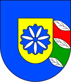 Blasonierung: „In Blau ein goldener Herzschild, darin eine blaue Kornblume mit einer oberen Blattlage aus sieben silbernen Blättern; durch drei leicht schräg gestellte silberne Blätter vom Herzschild zum hinteren Schildrand von Rot und Grün geteilt.“[10]