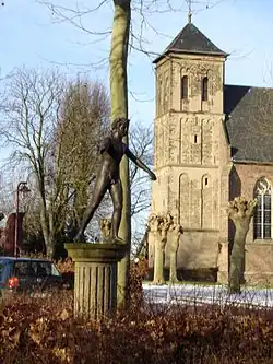 Der Lüttinger Knabe im Vordergrund der Kirche