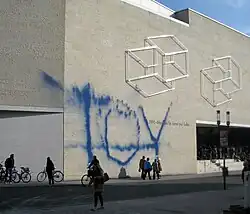 Zwei Supraporten von Josef Albers, neuer Standort: Seitenfront des Neubaus (2014), Pferdegasse, mit Graffiti Toy (anonym, 17. September 2017)