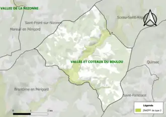 Das Schutzgebiet des Typus 1 bildet jedoch zusammen mit seinem talabwärtigen Pendant Réseau hydrographique et coteaux du Boulou aval (Entwässerungsnetz und Hanglagen des talabwärtigen Boulous) nur ein Teilstück einer weit ausgedehnteren Schutzzone (ZNIEFF des Typus 2), die unter der Bezeichnung Vallée et coteaux du Boulou (Talung und Hanglagen des Boulous) den gesamten Flusslauf des Boulous (inklusive seines linken Nebenflusses an der Südostgrenze des Gemeindegebietes) von seiner Quelle bis zur Mündung in die Dronne umfasst.
