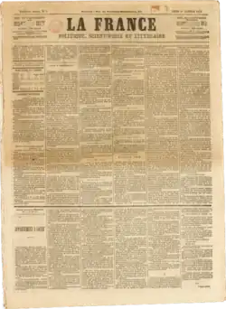 La France wurde von einer Gruppe von Senatoren, Abgeordneten, Industriellen und Grundbesitzern gegründet.[1] Die Finanzen wurden von D. Pollonnais[2], Generalrat der Alpes-Maritimes, verwaltet, während der Graf von Saint-Poncy[3][2], Präfekt des Départements Haute-Loire, das Amt des Chefredakteurs übernahm. Zur Redaktion gehörten Pier-Angelo Fiorentino[4][5] als Theaterkritiker und Louis Figuier[5] als Wissenschaftskolumnist sowie Horace de Viel-Castel[6][7] und Olivier de Jallin[8].