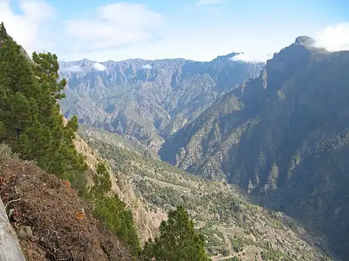An die Cumbre Nueva schließt sich ein in Nord-Süd-Richtung verlaufender Höhenzug, die Cumbre Vieja, an. Der Gebirgskamm erhebt sich bis auf rund 2000 m Höhe und teilt die Insel in zwei klimatisch unterschiedliche Hälften. Die Vulkanaktivität der Cumbre Vieja begann vor 150.000 Jahren und hält bis heute an. Der vorletzte vulkanbildende Ausbruch fand 1971 an der Südspitze der Insel bei Los Canarios statt, wobei der Vulkan Teneguía entstand. Vom 19. September bis zum 13. Dezember 2021 ereignete sich ein Ausbruch in der Nähe der Cabeza de Vaca in der Cumbre Vieja in der Gemeinde El Paso. Der Lavastrom des neuen Vulkans Tajogaite floss nach Westen ab.[11]