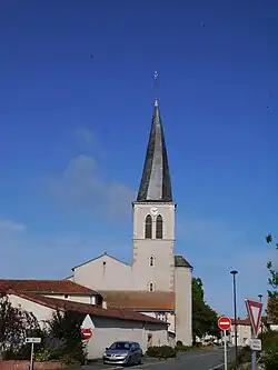 - Kirche Saint-Gervais-Saint-Protais mit Glockenturm mit einem spiralförmigen Helm