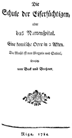 - Die Schule der Eifersüchtigen, oder das Narrenspital. Libretto (deutsch), Riga 1784 als Digitalisat bei der Staatsbibliothek zu Berlin