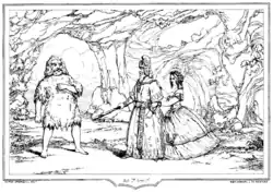 Links im Vordergrund ein schwarzer Felsen mit einem Büschel roter Blumen; rechts der Ausgang von Prosperos Höhle; hinten eine große Kiefer, die offenbar von einem Blitz getroffen wurde: der Stamm ist in zwei Hälften zersplittert, aber dennoch hat der Baum einen großen Teil seines immergrünen Laubs behalten.