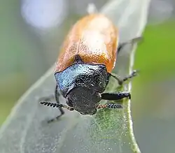 Der Körper ist zylindrisch und vorn und hinten abgestutzt. Er erreicht eine Länge von 6,5 bis 8,5 Millimeter. Der Geschlechtsdimorphismus ist stark ausgeprägt. Kopf und Halsschild sind metallisch grün oder blau, die Flügeldecken gelbbraun.