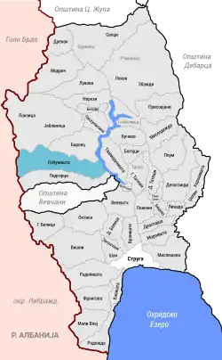 Die Gemeindehauptstadt Struga ist rund elf Kilometer Luftlinie südöstlich entfernt. Nachbarorte sind im Norden Boroec, im Osten Tašmaruništa und im Süden Podgorci.