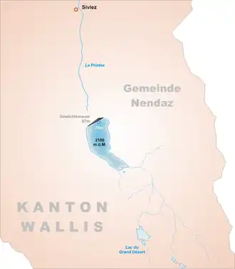 Das Speicherbecken wird von der Printze durchflossen, die in der Rhone mündet. Zusätzlich wird das Wasser der Tortin aus dem Nachbartal über einen 1,25 km langen Tunnel dem See zugeführt. Das Speichervolumen des Sees beträgt etwa 20& Millionen m³, die Seeoberfläche bedeckt etwa 0,50 km². Der See dient als Speicherbecken und ist über ein Pumpwerk mit dem Lac des Dix verbunden. Die maximale Stauquote beträgt 2186 m ü. M.
