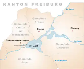 Der Lac de Montsalvens ist eine Schweizer Talsperre im Kanton Freiburg. Der Stausee liegt auf dem Weg zum Jaunpass, verteilt über die Gemeinden Broc, Châtel-sur-Montsalvens, Crésuz und Val-de-Charmey. Die Staumauer liegt hälftig auf den Gemeindegebieten von Broc und Châtel-sur-Montsalvens. Der Stausee mit einer Grösse von 70 Hektar füllt Teile der beiden Seitentäler Javro und Motélon unterhalb des Dorfes Charmey.[1]