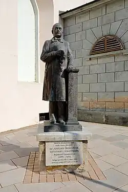 Denkmal vor der Basilika Güssing. Im Hintergrund der Zugang zur Batthyány-Familiengruft