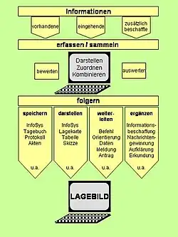 Alle gesammelten Informationen werden gespeichert oder dargestellt. Dazu werden vor allem Führungsinformationssysteme genutzt, die Meldungen automatisiert in graphische Lagedarstellung umsetzen und durch Überschreiben aktualisieren. Wichtige Informationen werden an die entsprechenden Bedarfsträger als Meldung oder Orientierung weitergeleitet oder in Befehlen oder Anträgen genutzt. Bestimmte Informationen können auch unmittelbar als Daten weitergeleitet werden. Häufig ergibt sich erst im Zusammenhang mit der Erstellung des Lagebildes zusätzlicher Informationsbedarf, der noch ergänzt werden muss.