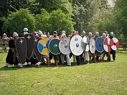 Laiendarsteller präsentieren den Aufbau eines Schildwalls während eines Mittelalterfestes