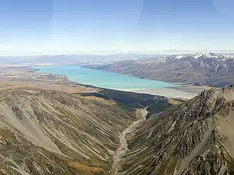 Der Lake Tekapo liegt auf 710 m Höhe zentral im Mackenzie Basin[1] der Region Canterbury und zählt damit zum Mackenzie District. Der See, der im Norden vom Schwemmland des Godley Rivers, im Osten von den Two Thumb Range und im Westen von den südlichen Ausläufern der Neuseeländischen Alpen begrenzt wird, hat eine Länge von 25 km und deckt eine Fläche von rund 95 km² ab.[2] Neben vielen kleineren und größeren Bächen stellen von West nach Ost der Cass River, der Mistake River, der Godley River, der Macaulay River und der Coal River, die größten Zuflüsse des Sees dar. Hauptabfluss des Sees bildet das Wasserkraftwerk Tekapo A, das das Wasser des Sees nach der Stromerzeugung in den Tekapo Canal leitet. Ein Teil des Abflusses wird reguliert auch über den Tekapo River geleitet. In dem See befinden sich vier Inseln, wovon Motuariki Island die größere ist.[5]