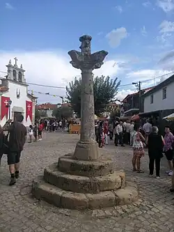 Der Schandpfahl in der Ortsmitte von Lamas de Orelhão an einem Festtag, September 2019