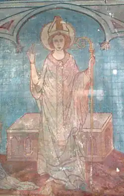St. Lambertus, Statue in Mingolsheim, mit dem Schwert als ikonographischem Zeichen für die Art seines Martyriums