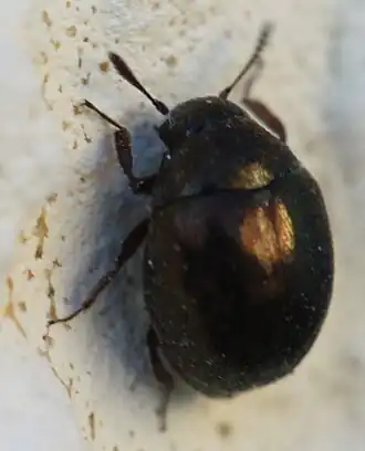 Die kurz-ovalen Käfer besitzen eine Körperlänge von 3,5 mm.[1] Die Oberseite der Käfer ist metallisch grünlich schimmernd, seltener blaugrün oder bronzefarben, die Unterseite ist dunkelbraun oder schwarz. Ober- und Unterseite sind spärlich behaart mit kurzer, anliegender Behaarung, sie sind dicht und fein punktiert. Die Flügeldecken besitzen keine Längsstreifen. Die Beine sind rotbraun gefärbt. Schenkel und Schienen der Beine sind breit abgeflacht, sie können an der Unterseite dicht angelegt werden, so dass der ganze Käfer eine gepanzerte Schutzform besitzt. Bei der Art sind die Vorderschienen gefurcht, so dass die Vordertarsen darin eingelegt werden können. Die Mittelschienen können in eine Grube der Hinterbrust eingelegt werden.[2]