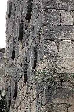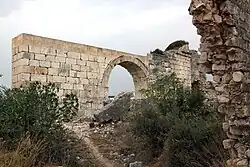 Das Bild im Westen ist ähnlich, die Außenmauer hat keine Zwischentürme, die innere einen kleineren etwa in der Mitte. Daneben ist ein antikes Tor römischen Ursprungs in die Mauer integriert. Nach Hellenkemper und Hild markiert es den Beginn des Cardo Maximus, der Hauptachse der römischen Stadt, nach Guyer und Herzfeld vielleicht einer monumentalen Säulenstraße, die über ein von der Burg überbautes Forum zu den beiden Tempeln führte, deren Reste östlich im Bereich der Vorburg liegen. Das Tor hebt sich durch sein sauber gefügtes Quadermauerwerk von dem seitlich anschließenden mittelalterlichen Mauerwerk ab. Seine äußere Fassade war durch vier Pilaster mit Akanthuskapitellen in drei Teilflächen aufgeteilt. In dem mittleren trugen zwei kleinere Pilaster den 5,90 Meter breiten Torbogen. In den seitlichen Flächen befand sich je eine Nische mit seitlichen Pilastern und einem Giebel. Ihren unteren Abschluss bildete eine weit vorspringende Konsole, was darauf hinweist, dass dort Statuen aufgestellt waren. Den oberen Abschluss des Tores bildete ein Gebälk aus dreiteiligem Architrav, Übergangsprofil und Fries, Eierstab und Zahnreihe, darüber trugen akanthusgeschmückte Konsolen das mit einer Sima abgeschlossene Geison. Das Tor wird ins späte 2. oder ins 3. Jahrhundert n. Chr. datiert, das Mauerwerk ist heute restauriert.