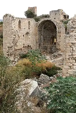 Im Inneren der Burg sind Relikte mehrerer Gebäude zu sehen, von denen drei als Kirchen zu erkennen sind. Eine davon befindet sich im Südwesten des Areals. Sie hatte ein Schiff von 4,07 Metern Breite und 7,23 Metern Länge, danach eine etwas schmaleren, 1,51 Meter tiefen Übergang zum Chor und im Osten eine 3,30 Meter breite und 2,17 Meter tiefe Apsis. Während heute nur noch die nördliche Wand und die Apsis mit dem Chor aufrecht stehen, konnten Guyer und Herzfeld noch alle Wände bis fast zum Dach beschreiben. Danach hatte das Gebäude eine Tür in der Süd- und eine in der Westwand. Der Beleuchtung dienten je zwei hochliegende Fenster in den Längsseiten und drei im westlichen Giebel. Dazu kamen ein Fenster in der Apsis und eine Öffnung in der Spitze des Chorbogens. Während dieser die Form eines Tonnengewölbes hatte, vermuteten Guyer und Herzfeld für das Schiff wegen der schwächeren Seitenwände eine Balkendecke. Etwa 20 Meter östlich dieser Kirche sind Reste einer erheblich kleineren Kapelle zu sehen, die nur über ein 3,70 × 3,86 Meter großes Schiff und eine Apsis von 2,20 Metern Breite und 1,38 Metern Tiefe verfügt.
