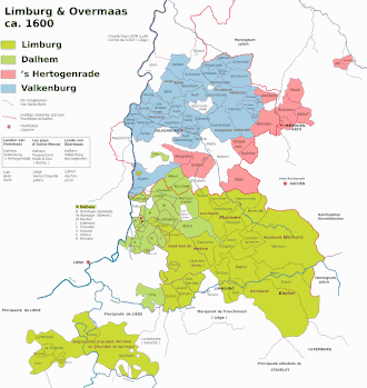 Auf diese Weise wurden diese vier autonomen Länder zusammen als eine der siebzehn Provinzen der burgundischen Niederlande betrachtet und später oft nur noch als Limburg und manchmal auch als die (nunmehr) vier Landen von Übermaas bezeichnet. Laut einer Erklärung der Staaten Limburg und Übermaas aus dem Jahr 1600 hatten die vier Hauptstädte zusammen weniger als 90 Haushalte.[2]