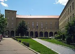 Durch hier L-förmigen Grundriss begrenzt der dreigeschoßige, denkmalgeschützte (siehe Liste, errichtet 1930–1933) Bau mit Satteldach zur Wichnerstraße hin einen überwiegend begrünten dreieckigen Vorplatz. Der linke L-Schenkel bildet die Hauptfassade, längs der im hohen Erdgeschoß ein Arkadengang zieht. An einer kleinen Innenbiegung der 9-achsigen Front schließt ganz links ein 2-achsiger Treppenturm an, der etwas vorspringt und mit einem Flachdach deutlich höher wirkt. Der Turm überwölbt mit Arkaden auch den öffentlichen Gehsteig. Durch einen etwas geringeren Achsabstand der Fenster im 1. und 2. Stock fluchten diese nur ungenau mit den Arkadenbögen des hohen Erdgeschoßes. Vor der Arkade liegt eine sackförmige Vorfahrt für Kfz. Hinter den mittleren drei Arkadenbögen führen Haustore in die dreigeschoßige Eingangshalle. Über den Arkadensäulen schmücken dort 4 Halbrelief-Gusssteinfiguren die Fassade. Im Inneren stellt Wamdmalerei Gut und Böse (Laster) als Figuren dar, rechts des Eingangs zum Schwurgerichtssaal am Balkon im 1. Stock etwa den "Geiz".[3]